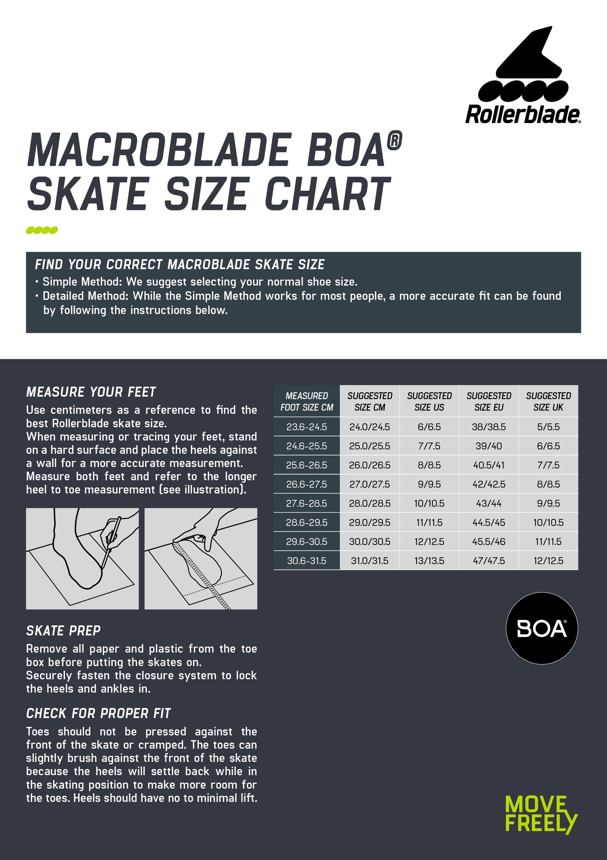 The Macroblade 84 BOA® combines Rollerblade® craftmanship, comfort and performance resulting in a skate with high-quality support, performance and it is easy to use. The higher cuff allows extra stability for balance control, the liner has padding in the tongue and ankle areas to provide sock-like comfort and lateral support. The BOA® Fit System delivers a micro-adjustable precision fit that can be obtained fast and effortlessly with just turning the dial and the Footboard Sizer provides two sizes in one skate. It enables skaters to insert the Footboard under the insole to create a snugger, more performance fit or remove it to accommodate the bigger size for more room in their skates. The aluminum frame design keeps you closer to the ground and improves performance by adding more power transfer and durability. 84mm Performance wheels with SG7 bearings add a little speed when engaged.